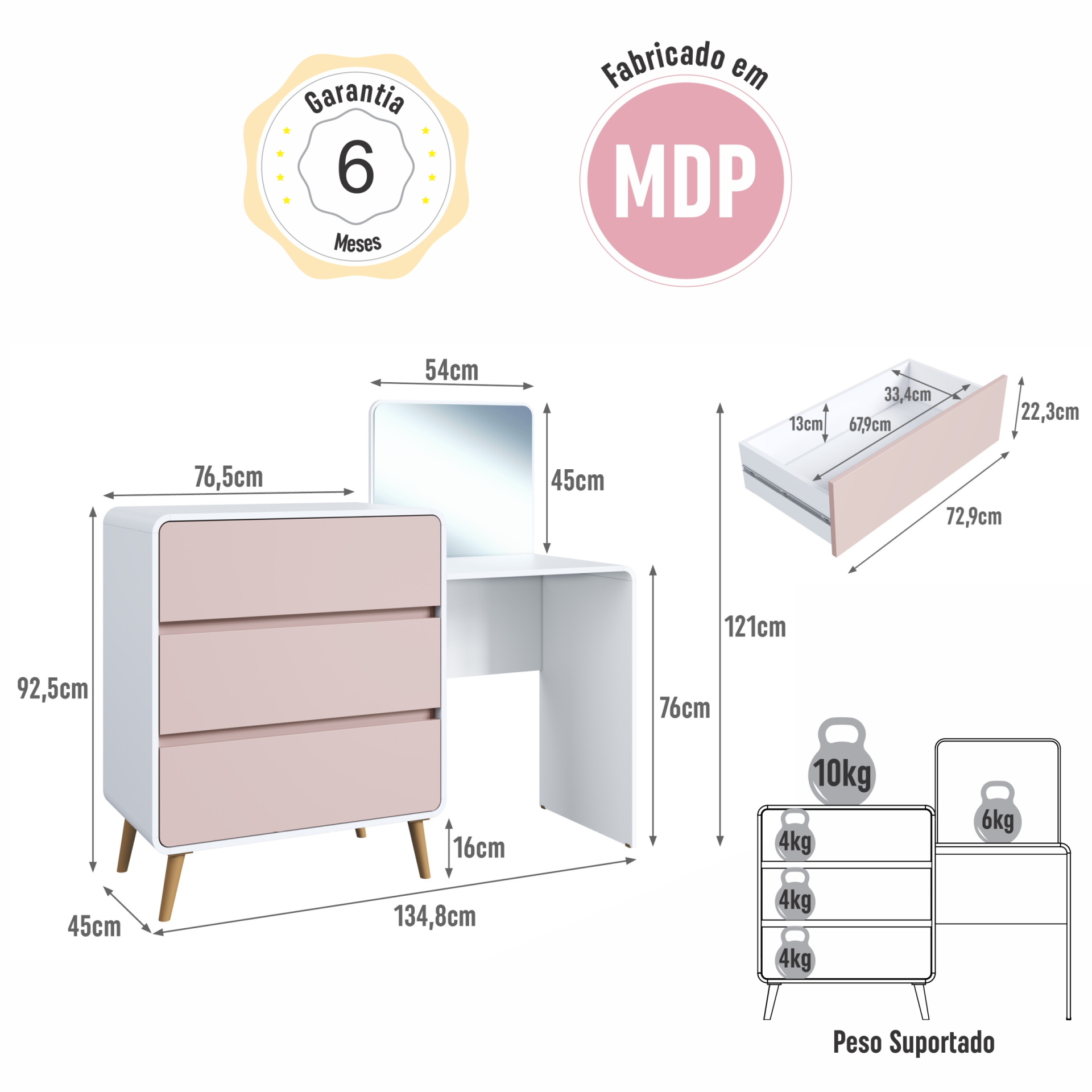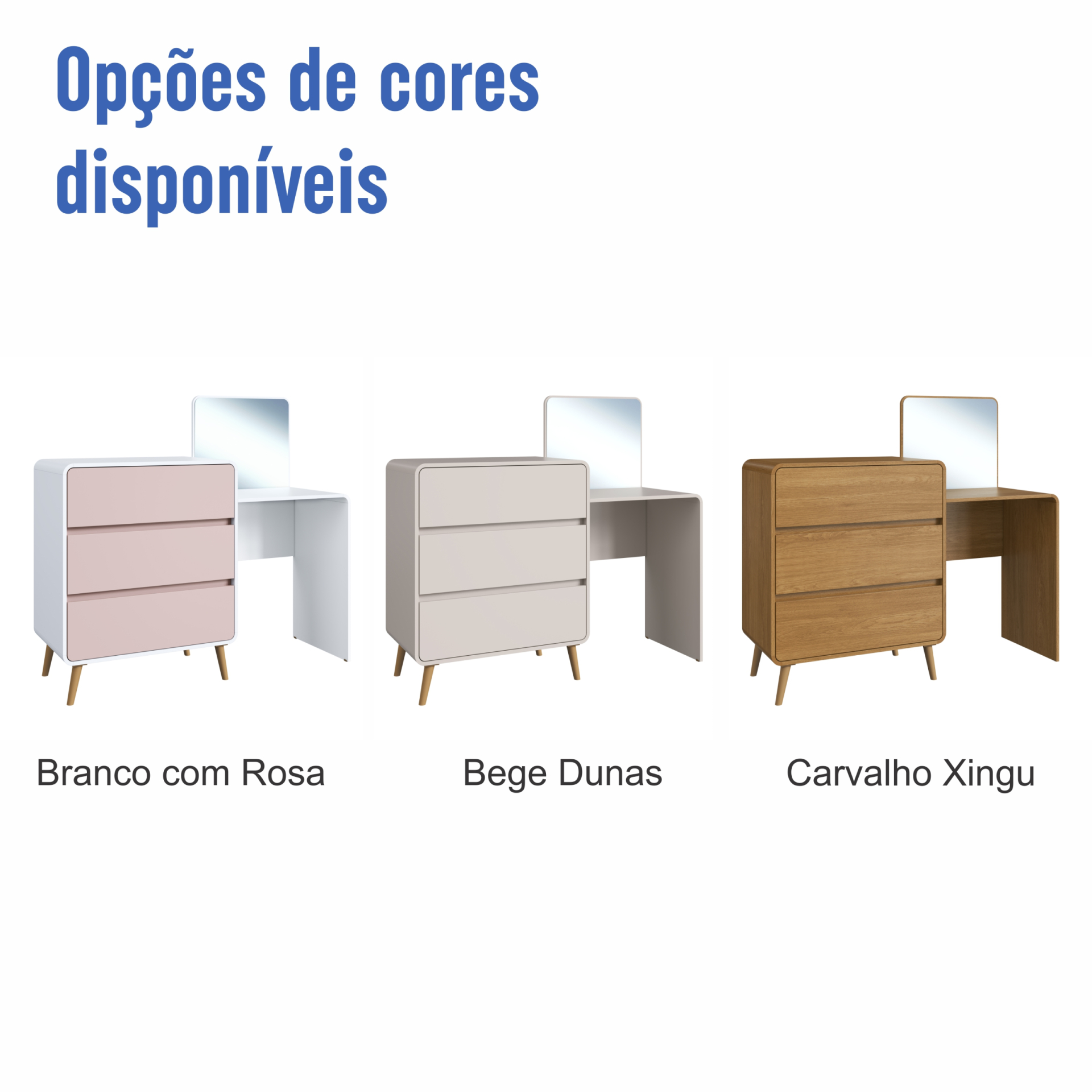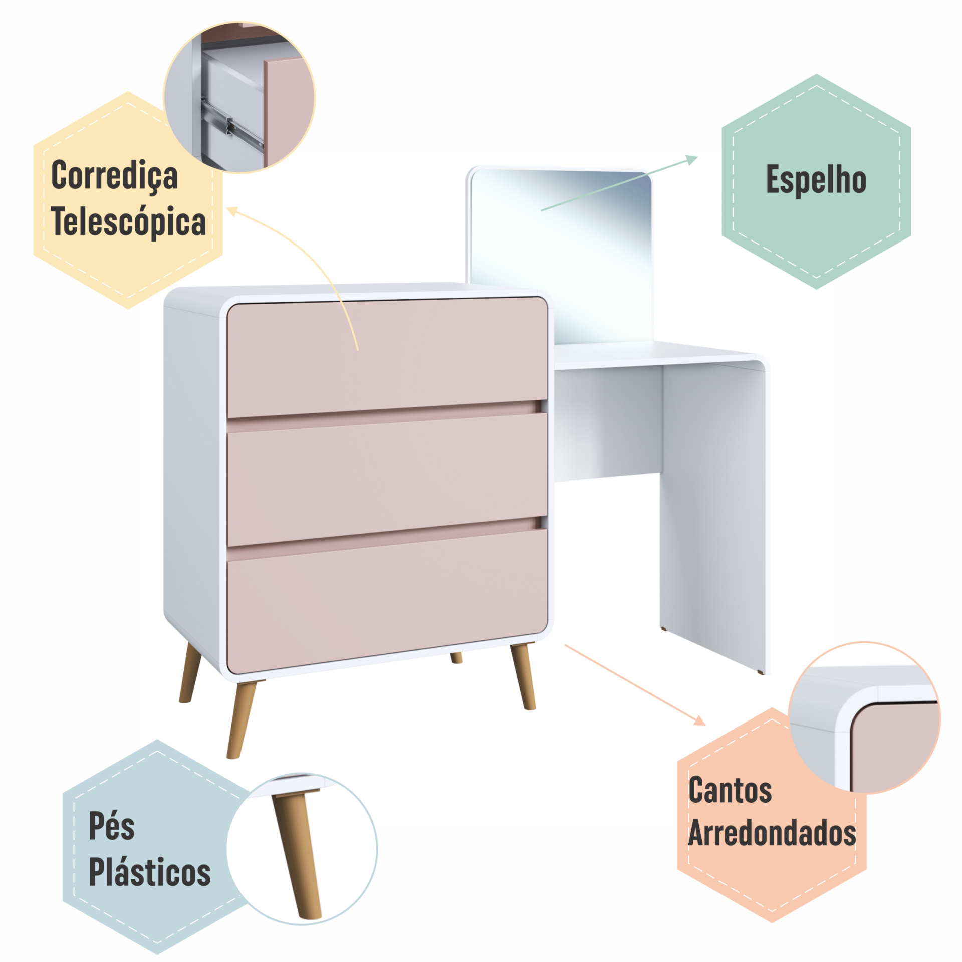 Cômoda Penteadeira com 03 Gavetas Linha Curve cor Branco com Rosa Milkshake